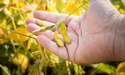 Soybean pods on soybean plantation, on farmer open palm hand background, close up. O mercado brasileiro de soja encerrou o dia sem registro de negócios, com...